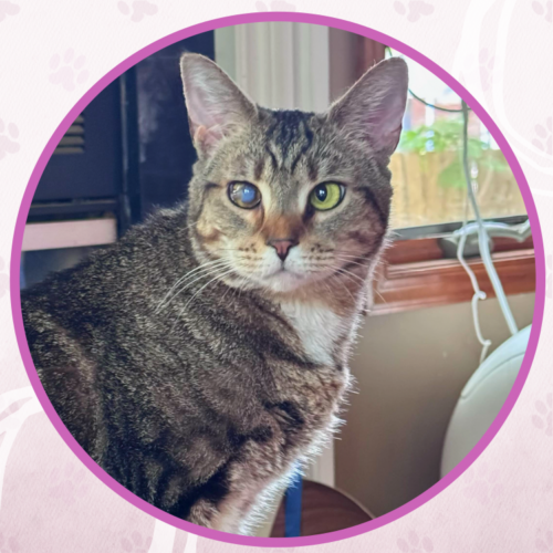 My name is Pam and I am part of the Office Litter. I came in really scared but have realized that people are pretty nice. I would love to find a home of my own, maybe with another cat or two so I have some company. I don't mind pets once I get to know you and once I'm comfortable, but my family will need to be patient with me. I'm what you would call a nervous nelly. You can see my eye is a little cloudy? Well I was playing a little too rough with a foster brother and I got that injury but it's not a big deal and the vet said that I can still see some out of it so it's all good and it doesn't bother me at all.